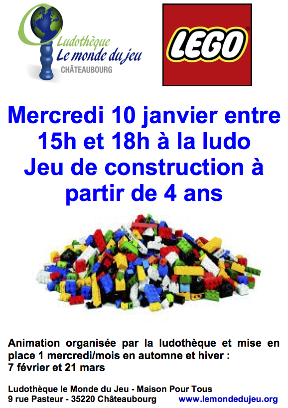 Alan Actualité / manifestations 27 décembre 2017 27 décembre 2017 La ludothèque organise son après-midi Lego mensuel le 10 janvier, de 15h à 18h. Venez nombreux !
