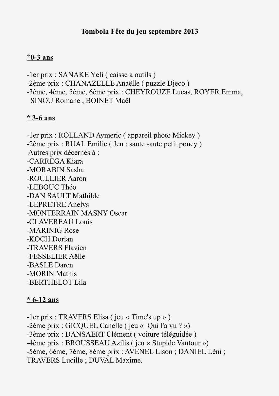 Et pour continuer , nous risquons de faire encore quelques petits heureux car voici le résultat de la tombola qui a été tirée mercredi après-midi.