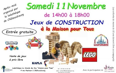 Le samedi 11 novembre étant férié, la ludothèque sera fermée le matin. Mais nous pourrons combler vos envies de jouer l’après-midi car l’après-midi Jeux de Construction aura lieu de 14h à 18h, à la maison pour Tous. Au programme Kaplas, Bunchems, jeux magnétiques, Lego et une vente de jeux à prix libre, dont la ludothèque se sépare.