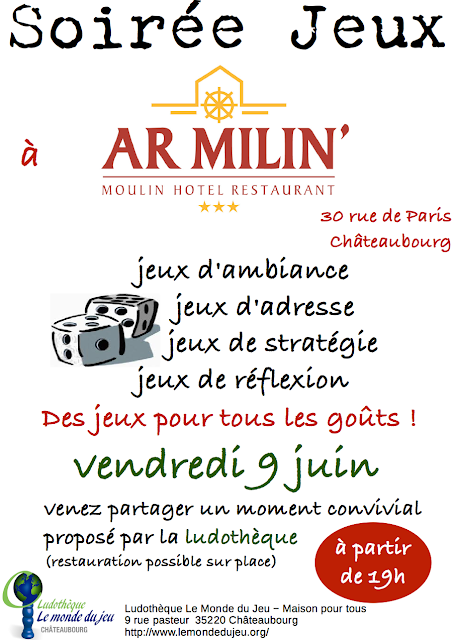 Alan Actualité / manifestations 2 juin 2017 2 juin 2017 La prochaine soirée jeux aura lieu au bistrot d’Ar Milin’ le vendredi 9 juin 2017 à partir de 19h. Restauration possible sur place. Venez nombreux !