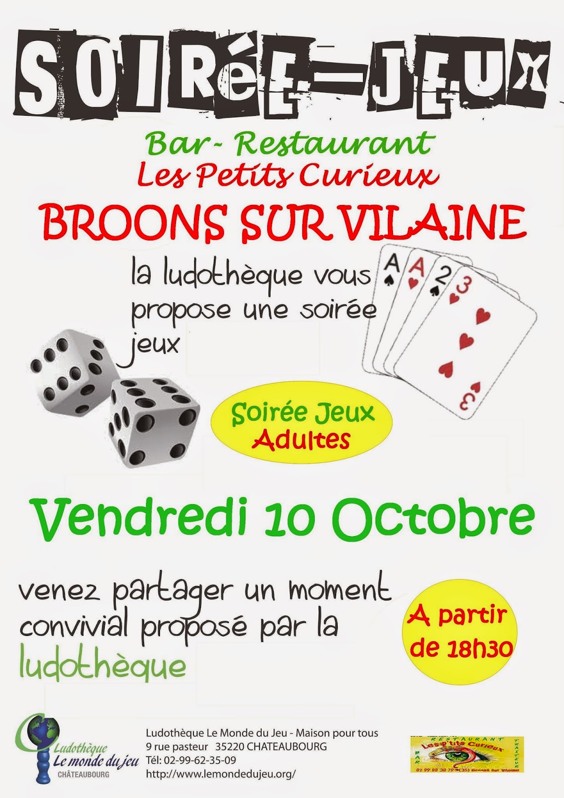 ludo35220 Actualité / manifestations 1 octobre 2014 1 octobre 2014 Et c’est reparti pour une nouvelle soirée jeux .Nous vous donnons rendez-vous le vendredi 10 octobre à partir de 18h30 aux Petits Curieux à Broons sur vilaine.A bientôt.