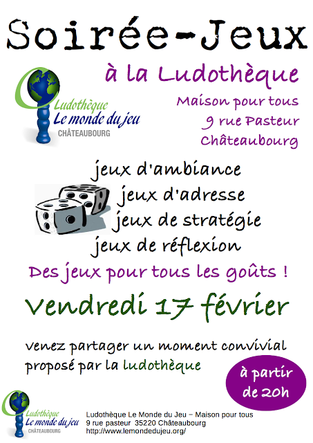 Alan Actualité / manifestations 31 janvier 2017 31 janvier 2017 La prochaine soirée jeux aura lieu à la ludothèque le vendredi 17 février 2017 à partir de 20h. Venez nombreux !