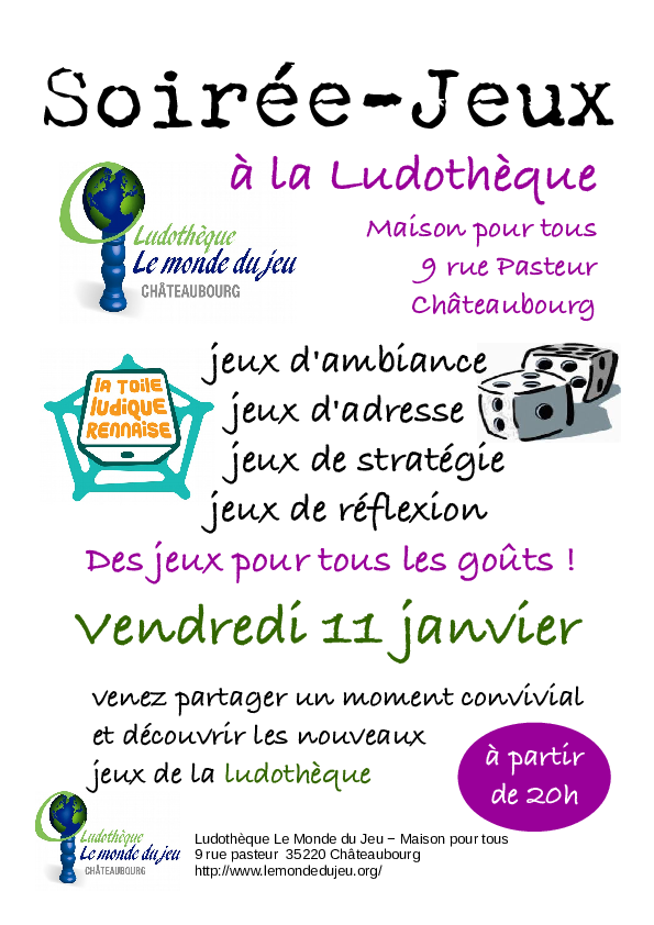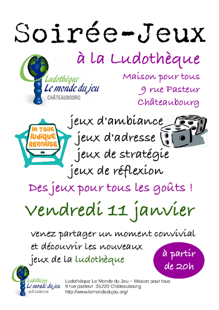 La prochaine soirée jeux aura lieu à la ludothèque le vendredi 11 janvier à partir de 20h. Cette soirée est organisée dans le cadre de la semaine du jeu organisé par la Toile Ludique Rennaise. Venez nombreux !
